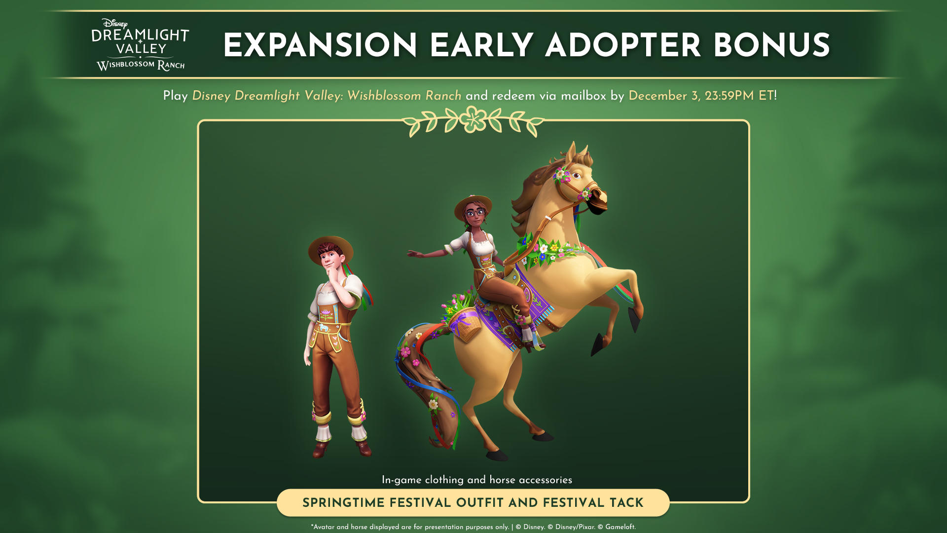 Players who get any edition containing the Wishblossom Ranch expansion between November 19th and December 3rd will receive exclusive rewards in their in-game mailbox.