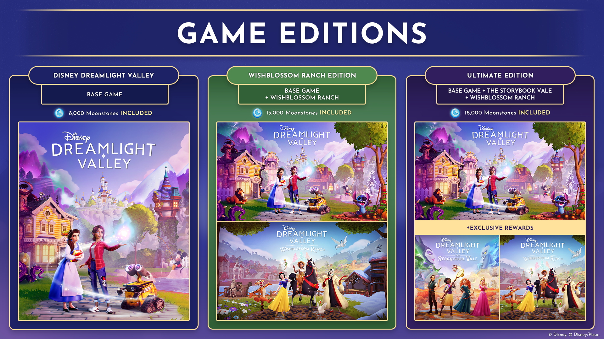 There is the base game, followed by the Disney Dreamlight Valley – Wishblossom Ranch Edition, which grants access to the base game, the new expansion, and a bundle of Moonstones; and the new Disney Dreamlight Valley – Ultimate Edition, which includes access to the base game, The Storybook Vale expansion pass, and all the contents of Disney Dramlight Valley: Wishblossom Ranch – Deluxe Edition mentioned above.