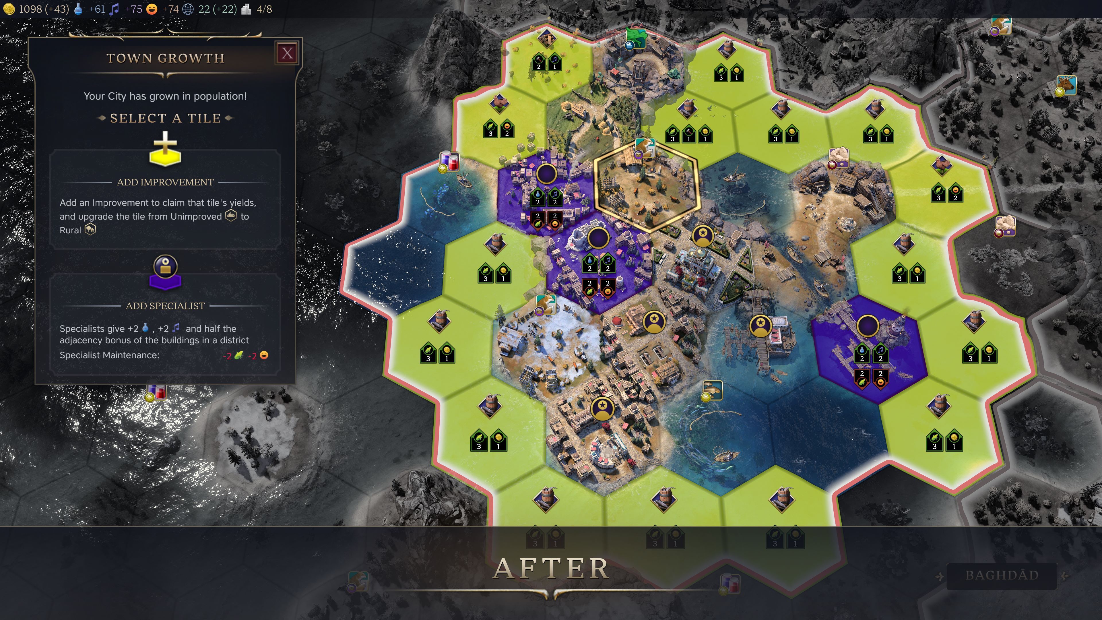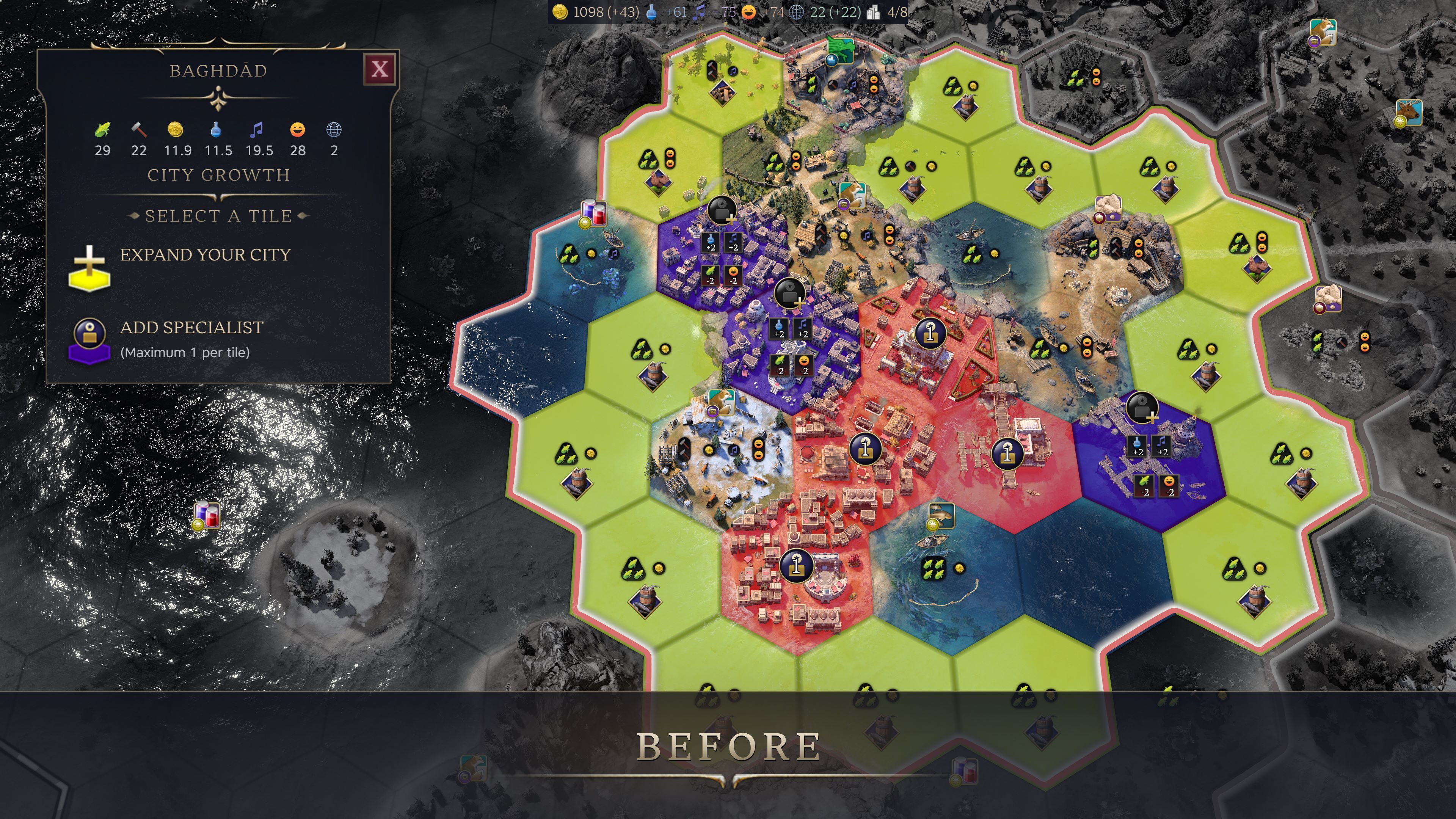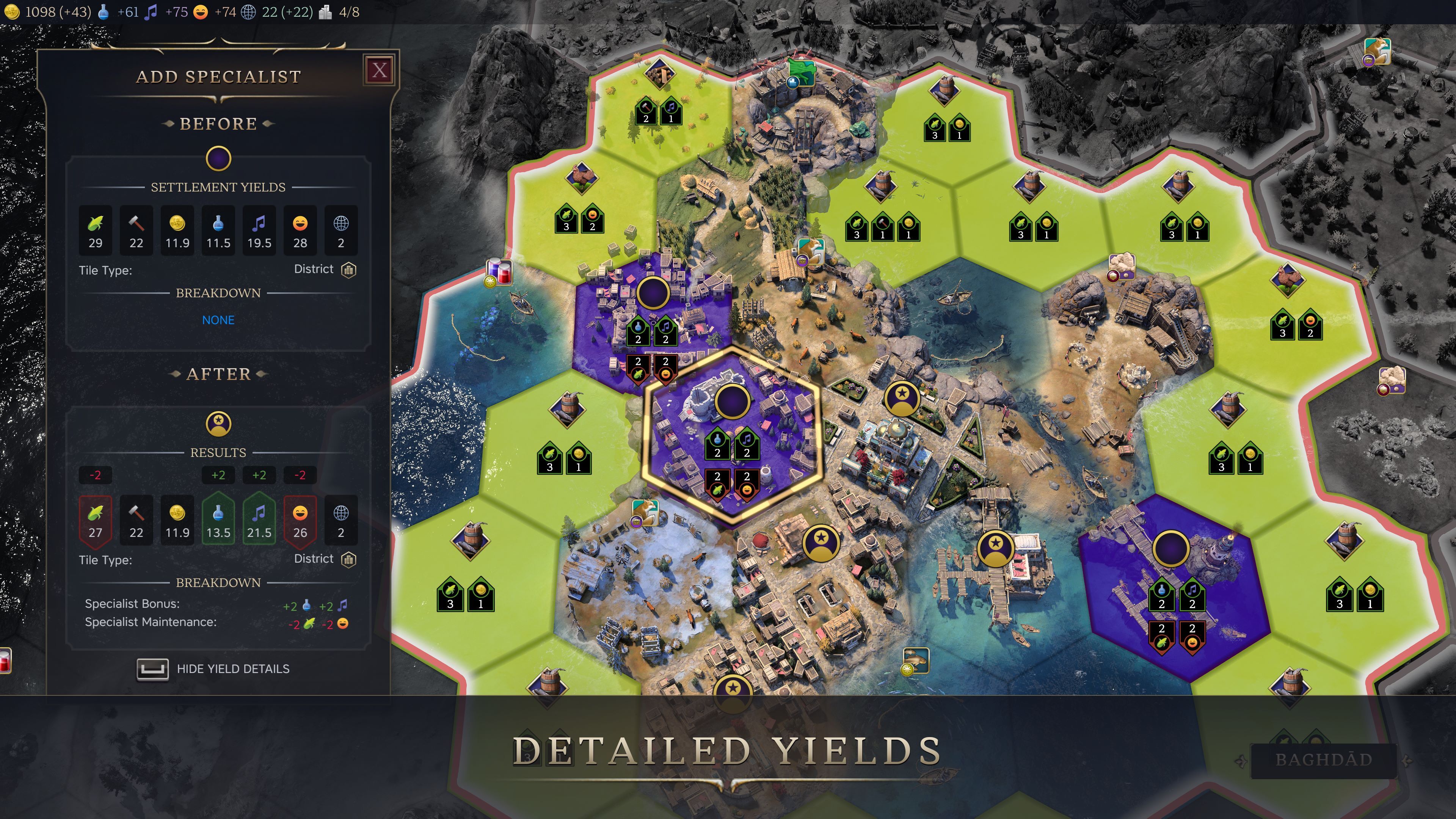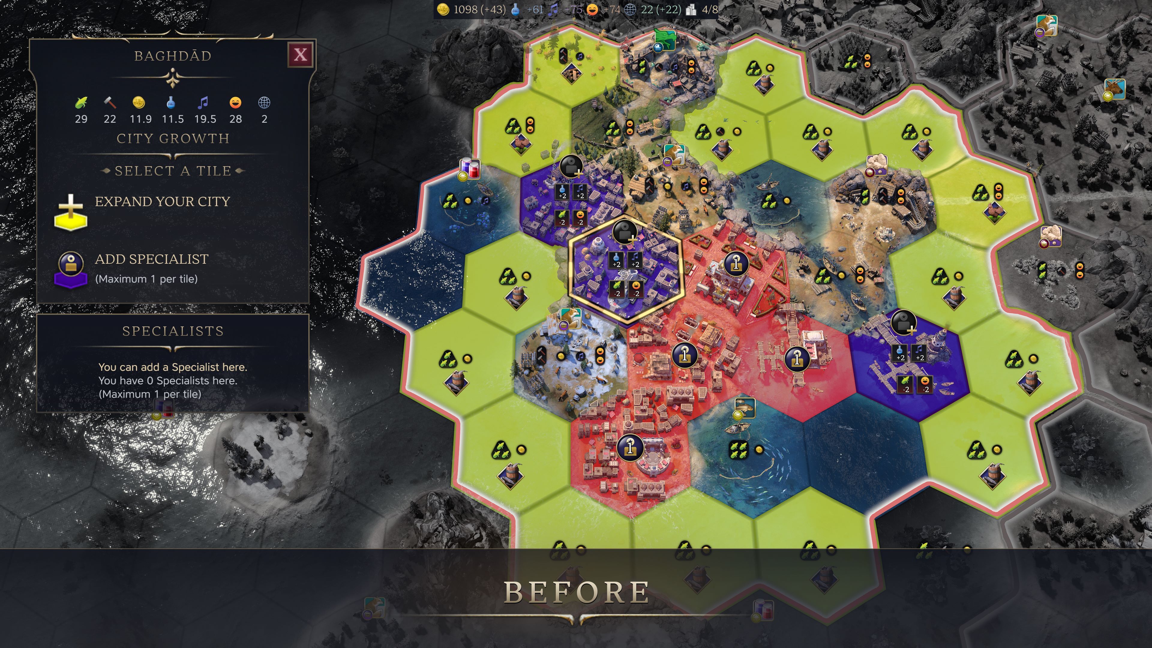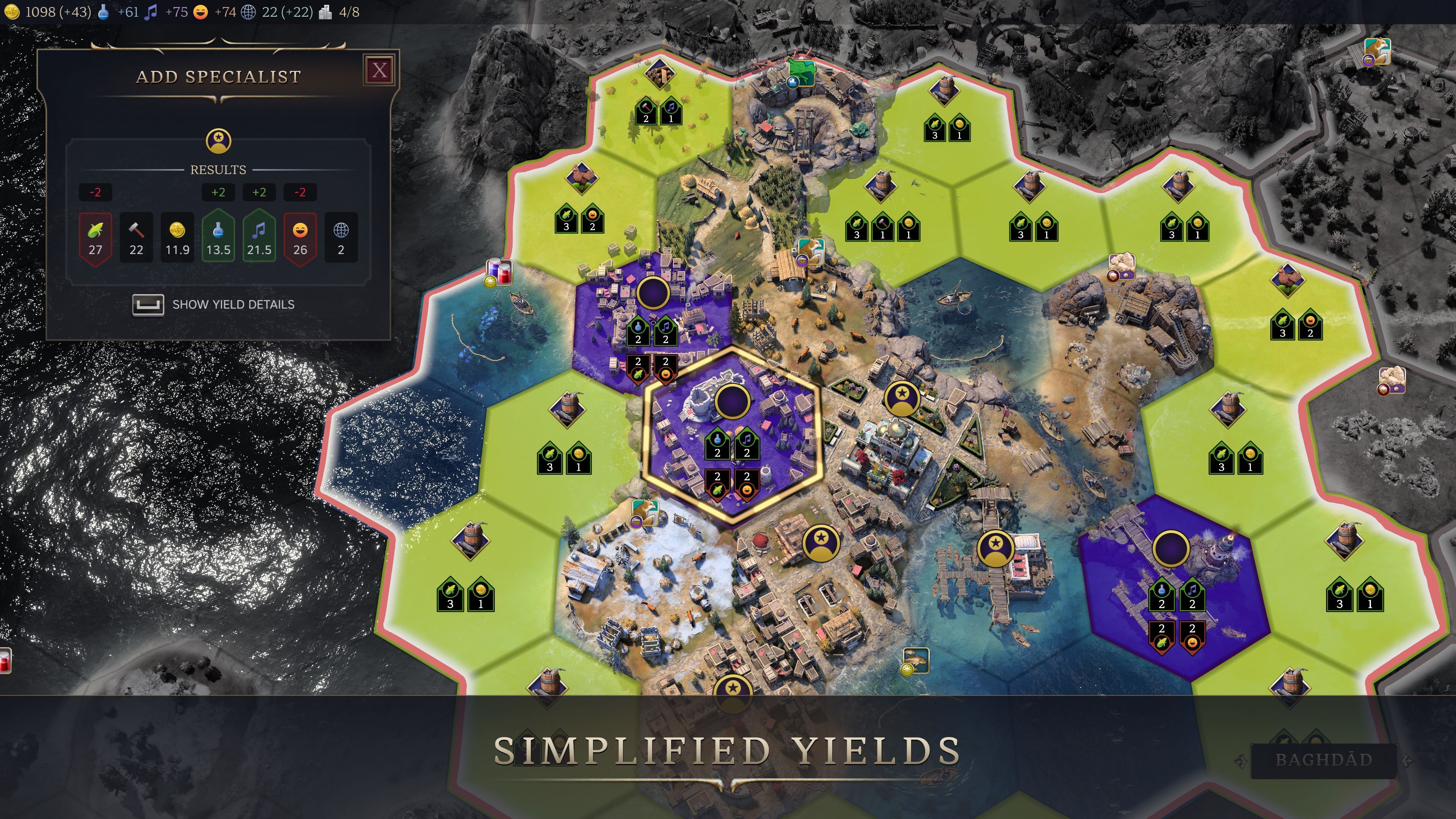 We’ve also refined how Specialists are presented. Urban tiles now display their current and max capacity more clearly, making it easier to see where you’re under-utilized or already full.