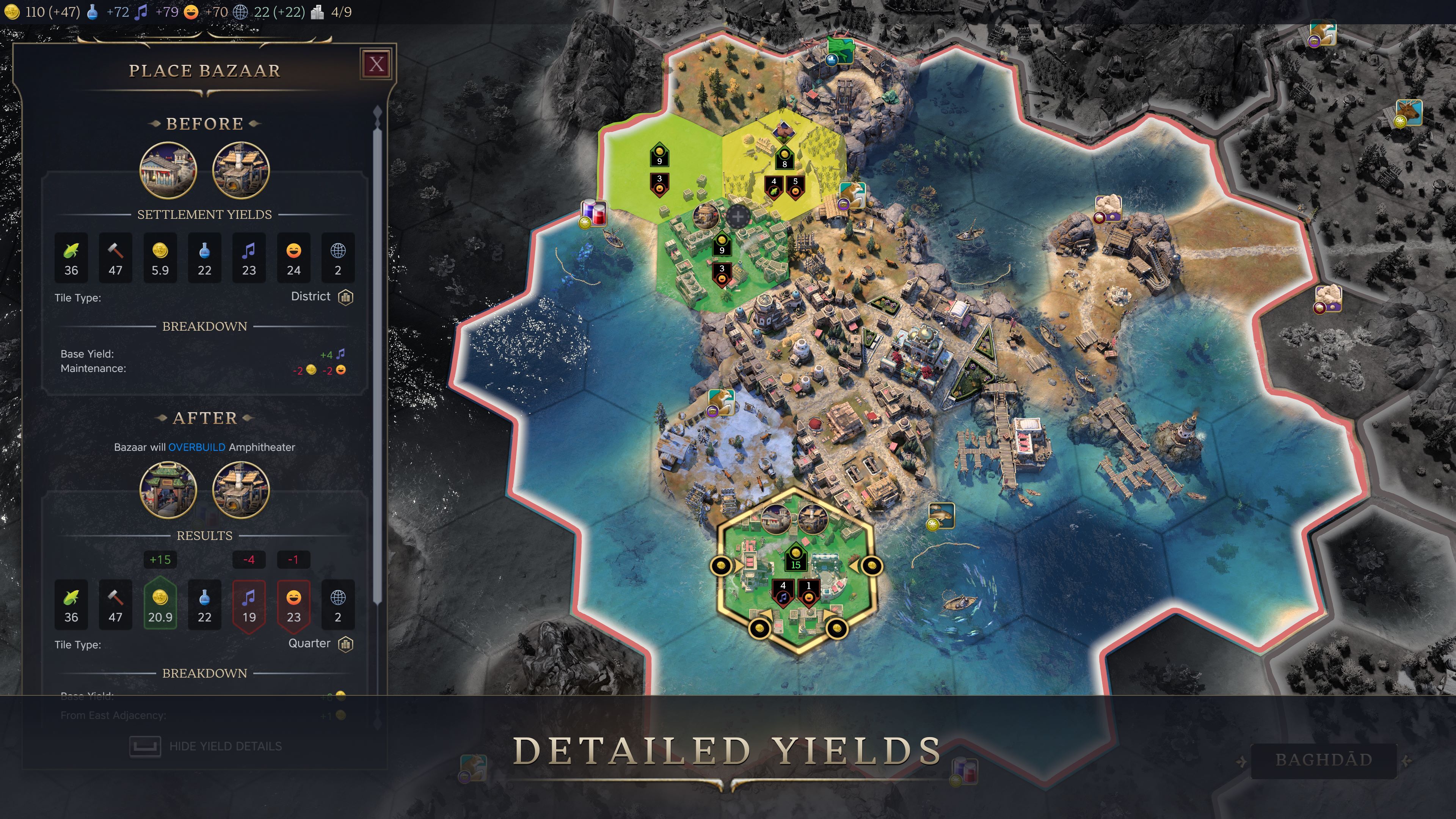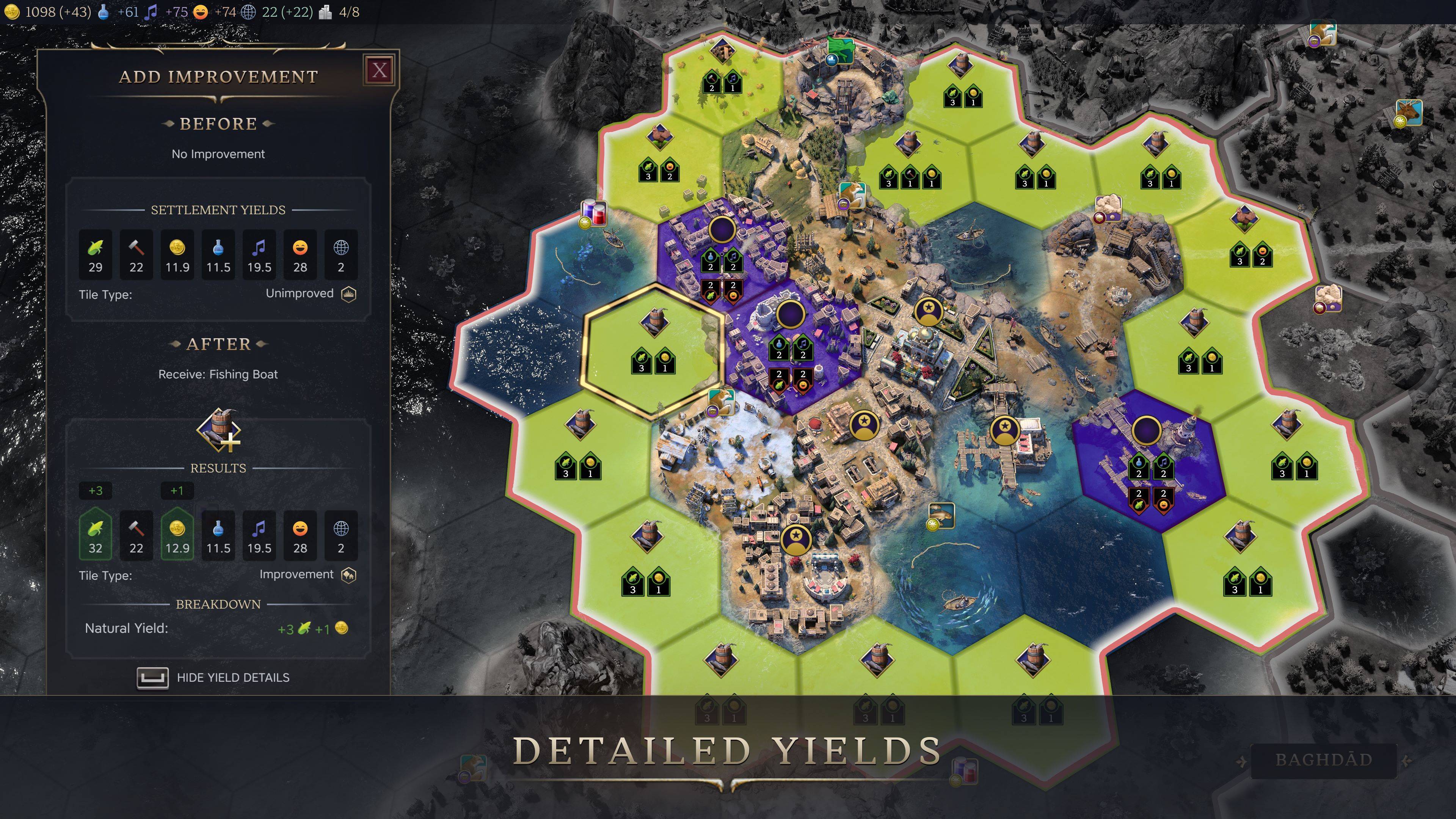 And like many decisions in Civ VII, the answer hinges on a lot: tile yields, Resources, Adjacency potential, maintenance costs, Specialist slots, border expansion, future plans, and more. So, we’ve upgraded how that decision is presented to help you make more informed choices without needing to guess.