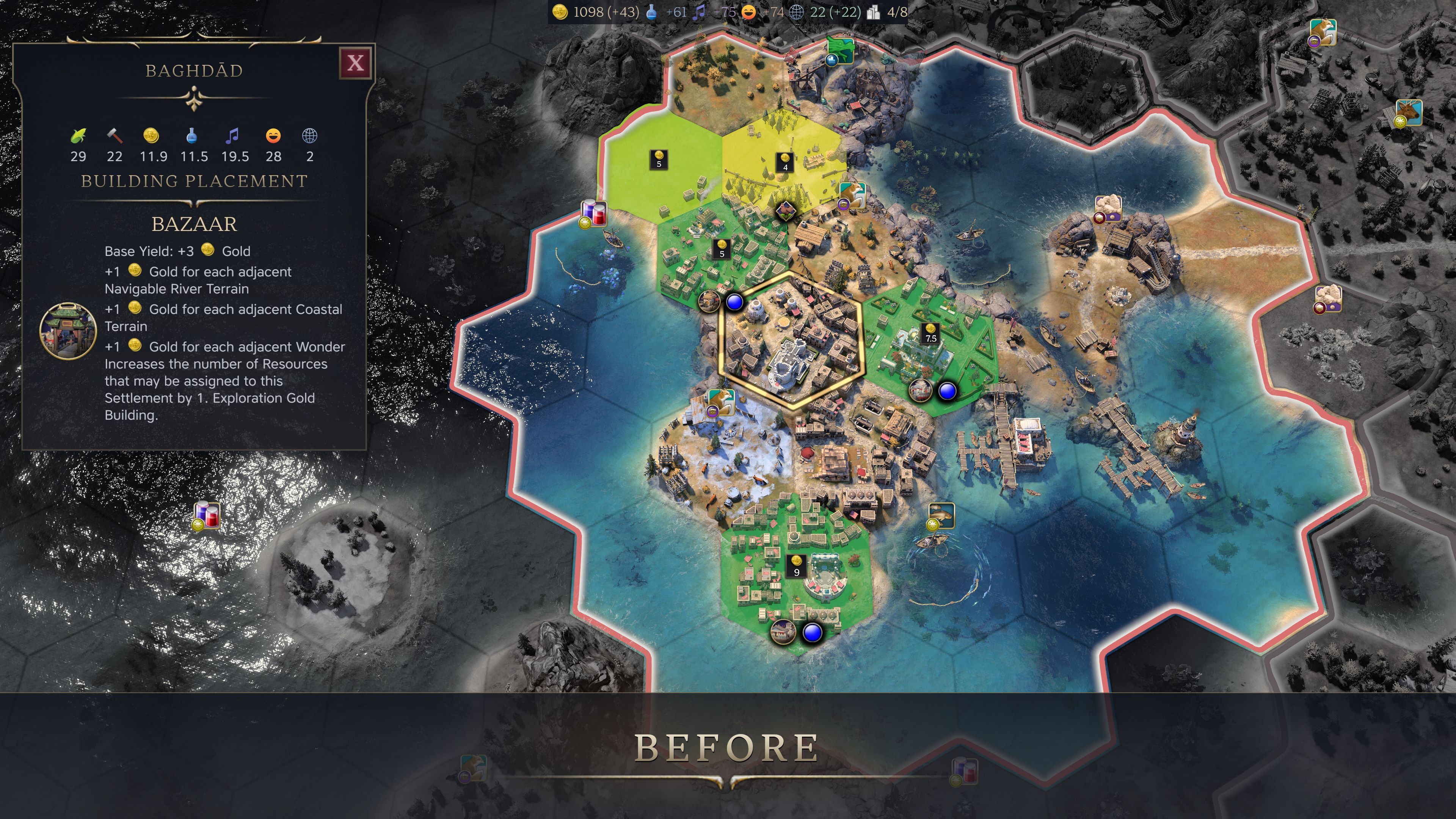 Placing a Building might seem simple on the surface, but it’s often anything but. You’re weighing a number of factors, including the Building’s Base Yields, tile stats, Adjacencies, Specialists, Overbuilding, District connections, unique Civ or Leader abilities, your long-term strategy, and so on. If you’re the kind of player who loves optimizing every one of these choices (hi, fellow Builder-type here), this can be incredibly satisfying. What’s less satisfying? Doing all that math with minimal help from the UI. So, we’ve made some improvements.