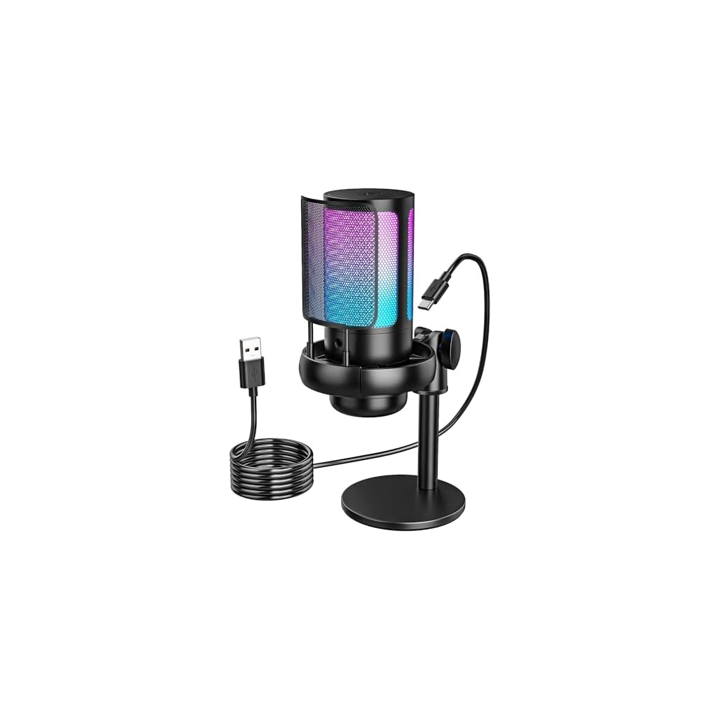 [Various and Controllable RGB] Three lighting modes on the fifine USB microphone show you up to 9 kinds of RGB light colors. Worked with RGB stream mic, the RGB control button gives you an easy way to select mode or color to make a difference for game scenes. Aesthetic of the gaming microphone for PC works well to your gamer setup or LED equipment to present pop and visual pleasant.[Intuitive Mic Control] 3.5mm headphones jack on the PC microphone allows to monitor if your audio is too quiet or harsh on streaming or Youtube video. You can operate the gain knob instead of MacBook or computer hotkeys to adjust mic volume up to real-time feedback. You can mute the streaming mic with one tap to avoid sneezing into a mess in game chat room.[Clear Sound Quality] Condenser mic capsule brings smooth sound with better sensitivity, capturing the vocal voice greatly even soft sound. Cardioid pickup pattern worked with the gaming PC mic reduces most fan or vent noises from your PC tower. The streaming microphone for PC gaming keeps obvious improved sound quality and accurate online chatting with gaming teammates in Discord or Twitch.[Noise Reduction] Skip hassle to cut back noises. PC gaming mic with external black metal pop filter softens plosives with B, P, T and more. That compact anti-vibration shock mount on computer microphone USB dampens vibration from keyboard or your hand touching desktop or laptop. Practical accessories clean unpleasant noises from your podcasting for more energetic sound.[Simple to Use] The standing gaming mic for video recording is plug-and-play for PC/Mac/computer/PS4/PS5, which is easily for home use, zoom meeting even if you are not a technically inclined individual. The base stand is quite solid, so the PC mic for gaming will not be easily knocked over. You can adjust the RGB mic thumbscrew if necessary to get a better recording position.