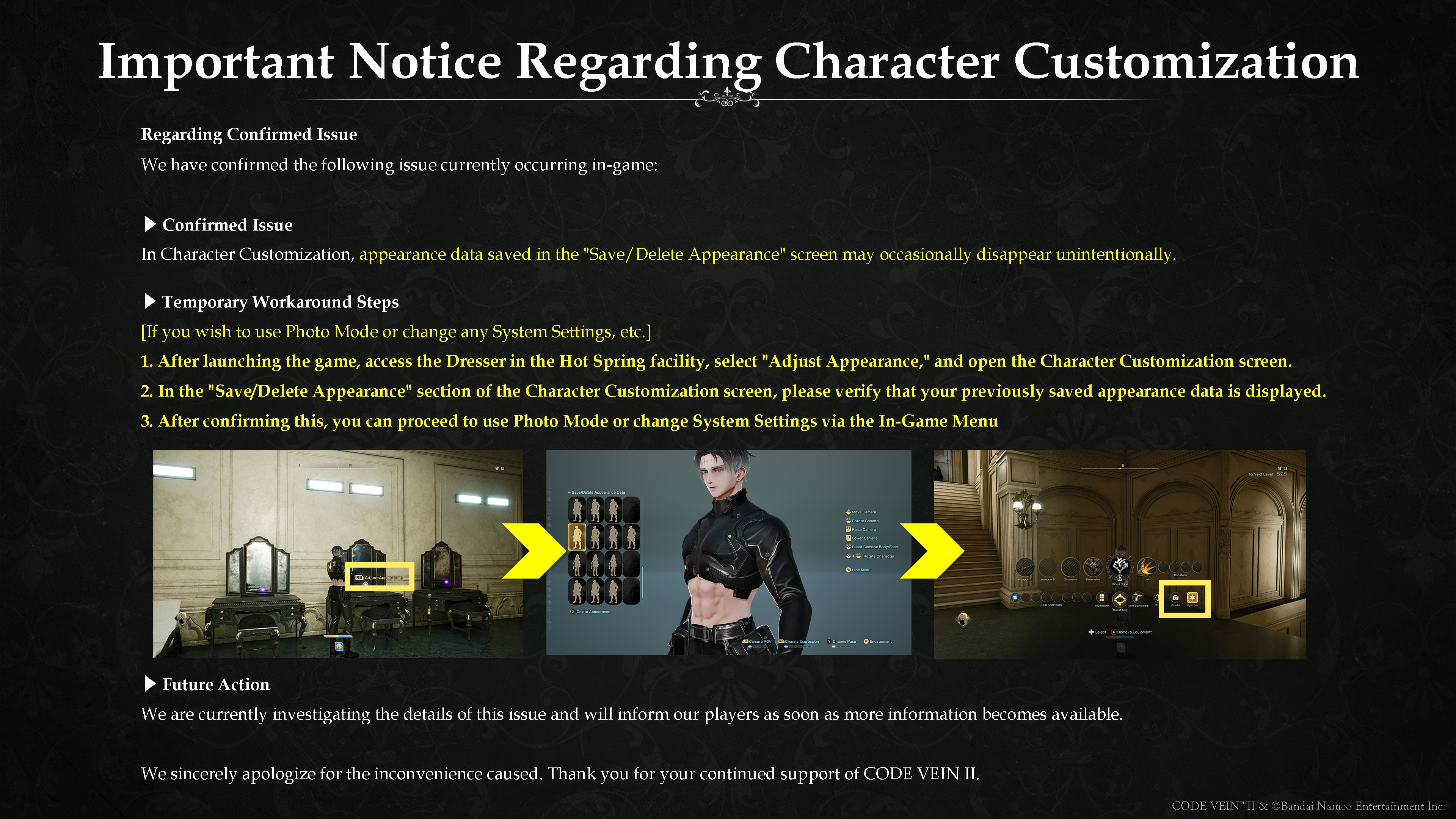 We have confirmed an issue in the currently available Character Creator Demo for CODE VEIN II, where data saved in “Save/Delete Appearance” may disappear unintentionally.