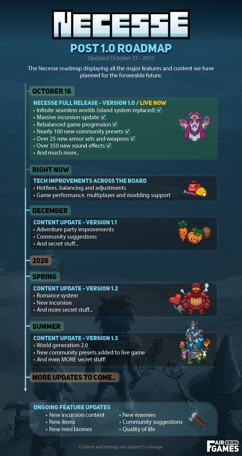 Below I’ve linked a brand new Necesse post 1.0 roadmap showcasing some of the features to come in future content updates.