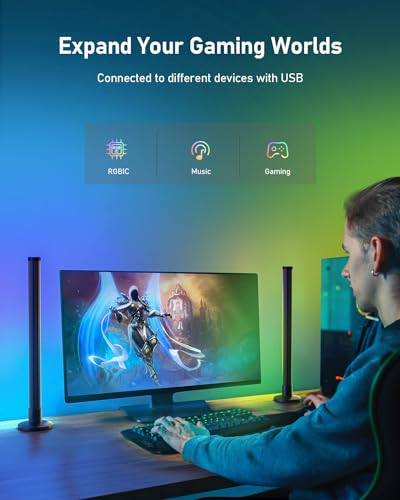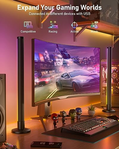 [Immersive Lighting Atmosphere] The upgraded smart light bar has length 42cm and 180° full-screen light, which greatly reduces dark corners and shadows, providing all-round lighting. With the built-in high-sensitivity sound sensor, the light will dance synchronously with the music, video and ambient sound to create an immersive sound and light space dimension, enhance your game/movie/party/dating experience.
